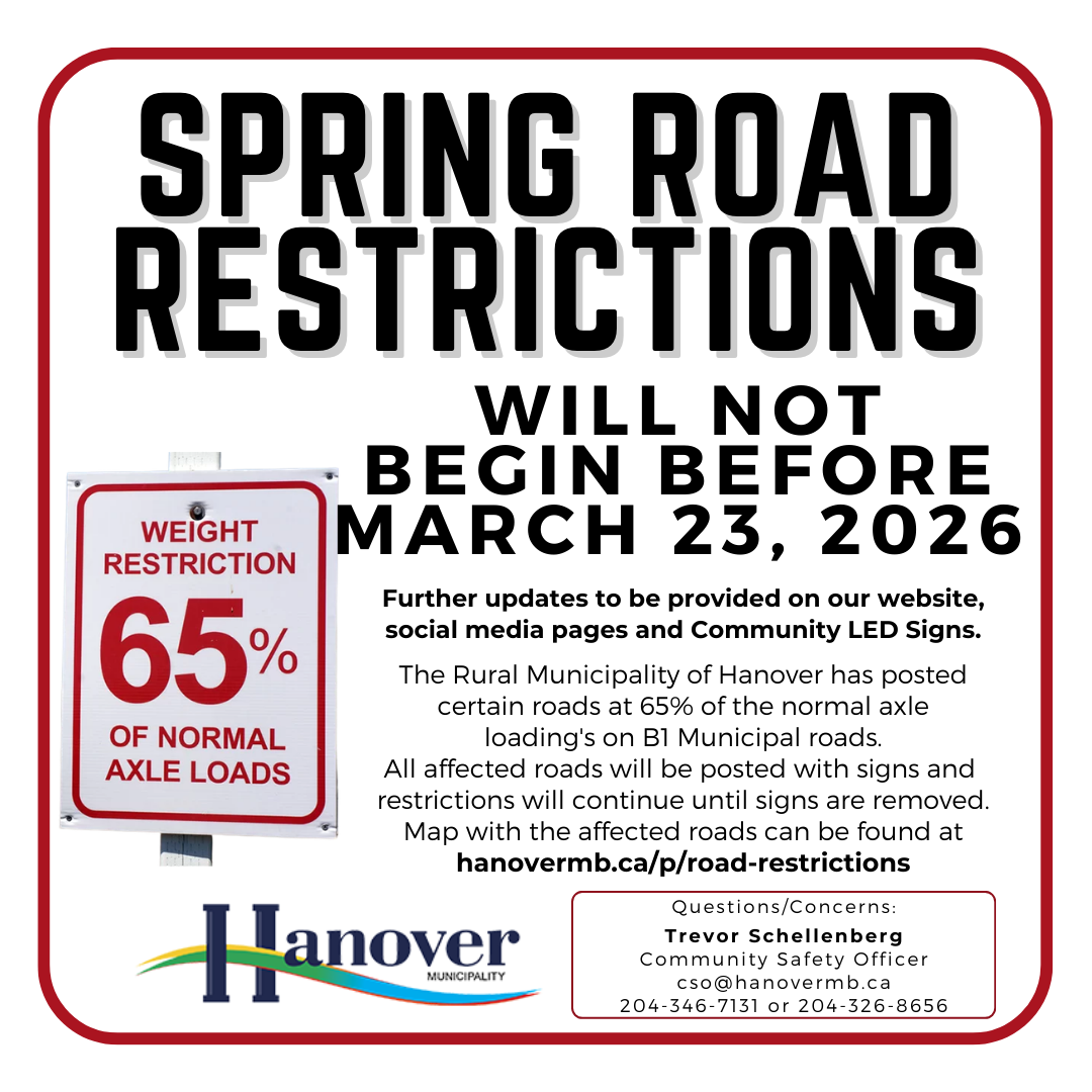 Any questions or concerns regarding spring weight restrictions should be directed to the By-law Enforcement Officer at 204-326-8656 or 204-346-7131. To report any other traffic violations, please contact your local RCMP detachment.